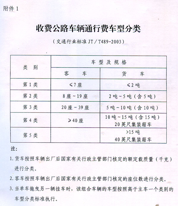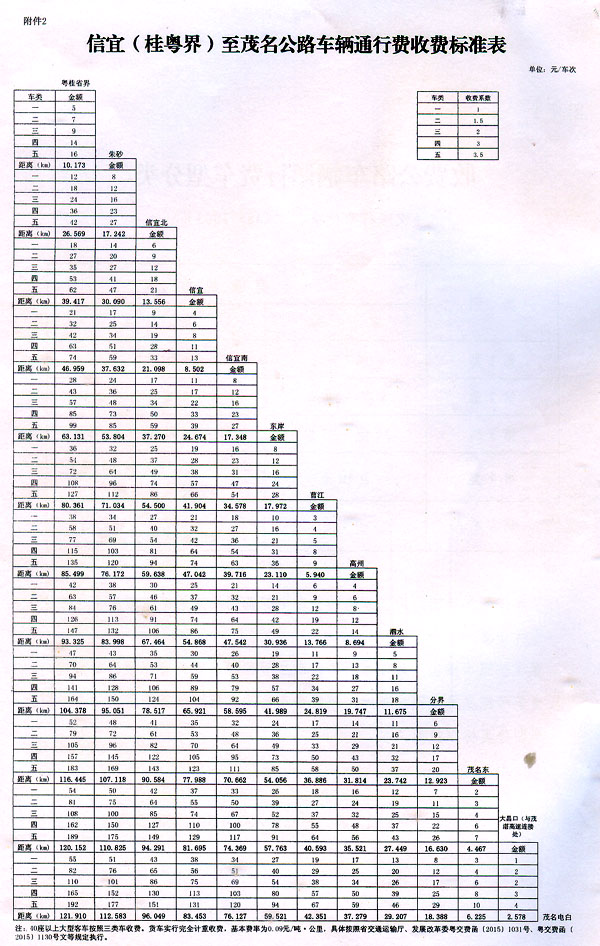 粵交費(fèi)〔2015〕1200號(hào)請(qǐng)示收悉。同意信宜(桂粵界)至茂名公路建成通車和收費(fèi)站收費(fèi)設(shè)施經(jīng)驗(yàn)收符合省聯(lián)網(wǎng)收費(fèi)技術(shù)要求后開始收費(fèi),收費(fèi)車型按國(guó)家統(tǒng)一標(biāo)準(zhǔn)進(jìn)行分類,一至五類車的收費(fèi)系數(shù)分別為1、1.5、2、3、3.5,收費(fèi)標(biāo)準(zhǔn)為0.45元/標(biāo)準(zhǔn)車公里;貨車實(shí)行完全計(jì)重收費(fèi),基本費(fèi)率為0.09元/噸·公里。