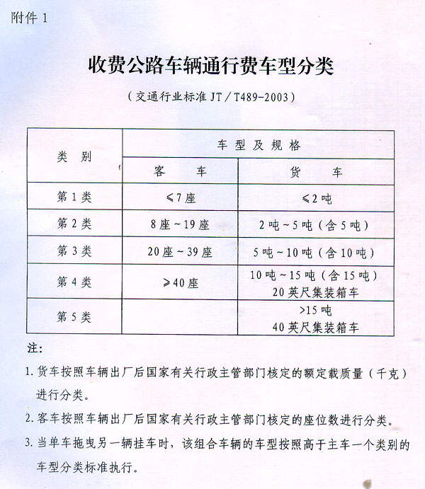 粵交費(fèi)〔2015〕1206號(hào)請(qǐng)示收悉。同意連平(贛粵界)至從化公路建成通車和收費(fèi)站收費(fèi)設(shè)施經(jīng)驗(yàn)收符合省聯(lián)網(wǎng)收費(fèi)技術(shù)要求后開始收費(fèi),收費(fèi)車型按國(guó)家統(tǒng)一標(biāo)準(zhǔn)進(jìn)行分類,一至五類車的收費(fèi)系數(shù)分別為1、1.5、2、3、3.5,收費(fèi)標(biāo)準(zhǔn)為0.6元/標(biāo)準(zhǔn)車公里;貨車實(shí)行完全計(jì)重收費(fèi),基本費(fèi)率為0.12元/噸·公里。
