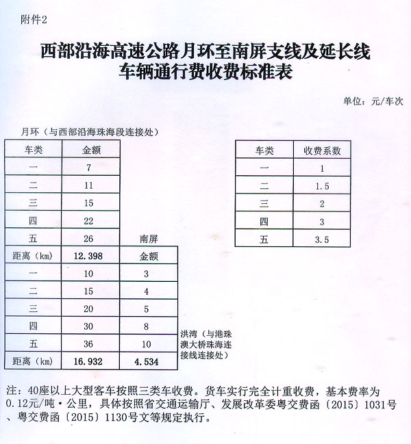 粵交費(fèi)〔2015〕1393號(hào)請(qǐng)示收悉。同意西部沿海高速公路月環(huán)至南屏支線及延長線建成通車和收費(fèi)站收費(fèi)設(shè)施經(jīng)驗(yàn)收符合省聯(lián)網(wǎng)收費(fèi)技術(shù)要求后開始收費(fèi),收費(fèi)車型按國家統(tǒng)一標(biāo)準(zhǔn)進(jìn)行分類,一至五類車的收費(fèi)系數(shù)分別為1、1.5、2、3、3.5,收費(fèi)標(biāo)準(zhǔn)為0.6元/標(biāo)準(zhǔn)車公里;貨車實(shí)行完全計(jì)重收費(fèi),基本費(fèi)率為0.12元/噸·公里。