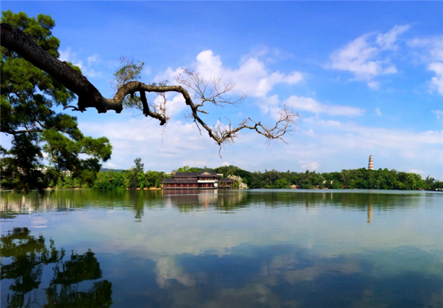 “鐵鏈鎖孤舟,浮鵝水上游,任憑風(fēng)浪起,此地永無憂!”一首膾炙人口代代相傳的民謠,唱出了“半城山色半城湖”的秀美與奇特、嫵媚與風(fēng)情!城在湖中,湖在山中,不出城郭可獲山水之怡;推窗見水,開門看綠,身居鬧市亦有林泉之趣。