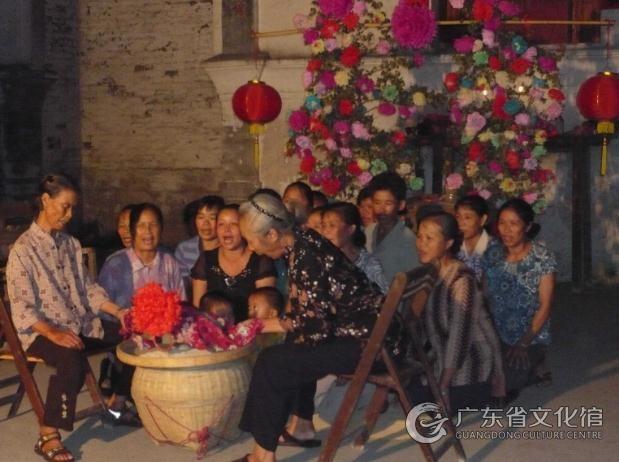 “月姐歌”以當(dāng)?shù)鬲?dú)有的方言演唱,無伴奏清唱,有獨(dú)唱、合唱、對唱、表演唱等形式。歌詞涉及大量的農(nóng)業(yè)生產(chǎn)、生活、氣節(jié)的內(nèi)容,或敘事抒情,或敘述時令節(jié)氣,或描寫人間的冷暖世態(tài),或歌唱愛情?!霸陆愀琛被顒佑蓽?zhǔn)備活動、接月姐、迷月姐、送月姐四部分組成。其中迷月姐為活動重要環(huán)節(jié),包括:“繡香包”調(diào)、“石榴打花”調(diào)、“睇龍船”調(diào)三大部分。“繡香包”調(diào)屬于宮調(diào)式,內(nèi)容主要表達(dá)男女之間的純真愛情;“石榴打花”調(diào)屬于徵調(diào)式,最具代表性,內(nèi)容多為表達(dá)人們對美好生活的向往;“睇龍船”調(diào)屬于羽調(diào)式,主要描寫人們賽龍舟時的熱鬧情景。