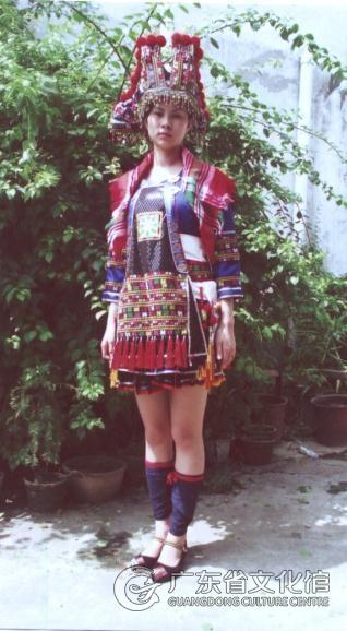 女裝包括長衣、內(nèi)裙(百褶裙)、護衣、圍裙等;服飾由頭飾、圍裙、腰帶、腳綁、大方巾等刺繡飾品。佩有三角耳環(huán)、手鐲、金銀釵、銅錢、銅扣、銀扣、珠子等;刺繡品用紅、黃、綠、青、白五種顏色,多以紅黃綠為主色調(diào)。除日常服飾外,女裝還區(qū)分為未婚少女裝、已婚婦女裝、嫁裝和師娘、歌嬤服等。女裝注重頭部裝飾和腰部以下的裝飾,頭飾有未婚和已婚之別,而腰飾的穿戴條理則可體現(xiàn)生活狀況,腳綁是瑤族婦女適應(yīng)大山生活,用以防蚊蟲、蛇、草、刺等。此外,乳源瑤族服飾中的童裝主要表現(xiàn)在兒童帽和上衣的標(biāo)志,且多以鈴鐺、銅錢等信物代表吉祥、辟邪等寓意,以祈求神靈保佑,禱告新生命健康成長。