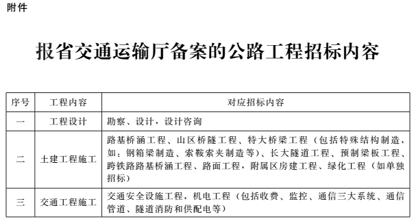 (二)國家審批(核準(zhǔn))的技術(shù)特別復(fù)雜的特大橋梁、特長隧道項目除主體工程施工招標(biāo)可由省交通運輸廳上報交通運輸部備案外,其他招標(biāo)內(nèi)容由省交通運輸廳負(fù)責(zé)備案。