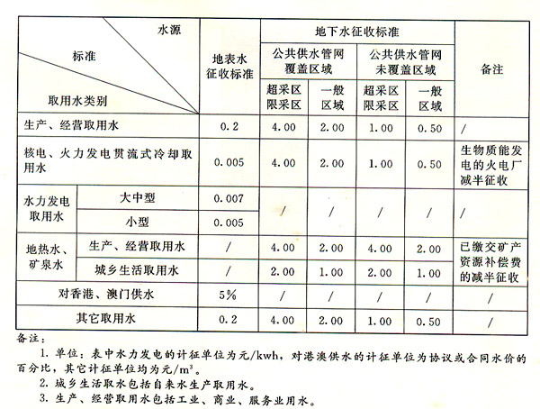 三、以下取用水類別的征收標(biāo)準(zhǔn)不作調(diào)整:核電、火力發(fā)電貫流式冷卻取用水,水力發(fā)電取用水,以及對(duì)港澳供水。
