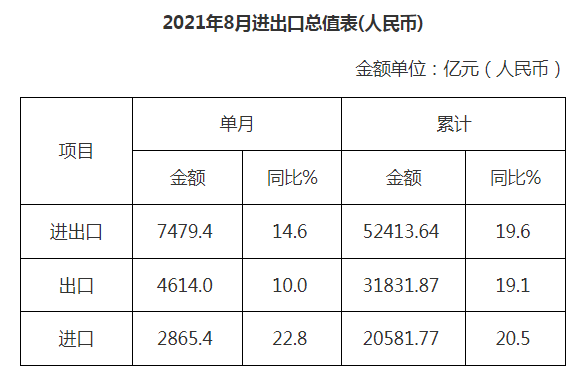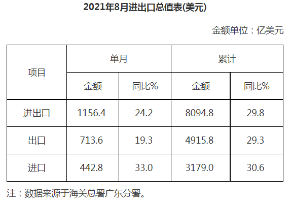 廣東省外貿(mào)進(jìn)出口總值表(2021年8月)