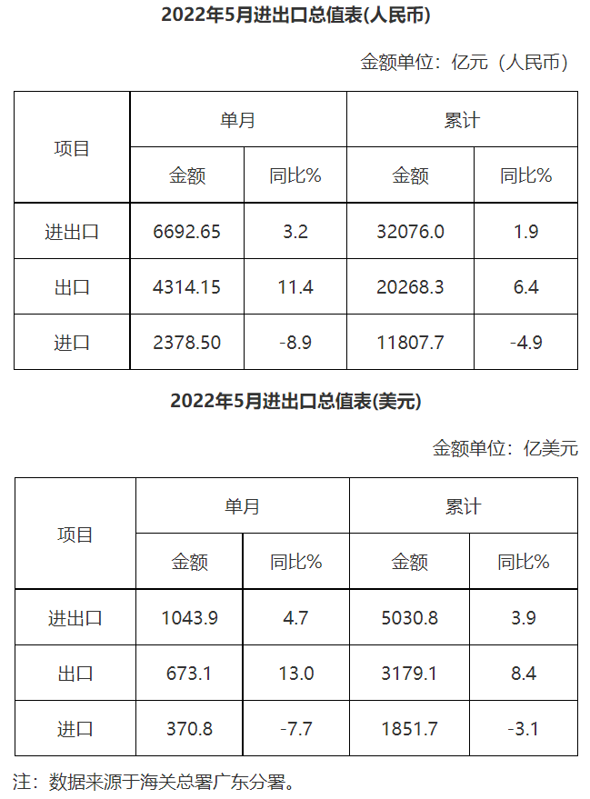 廣東省外貿(mào)進(jìn)出口總值表(2022年5月)