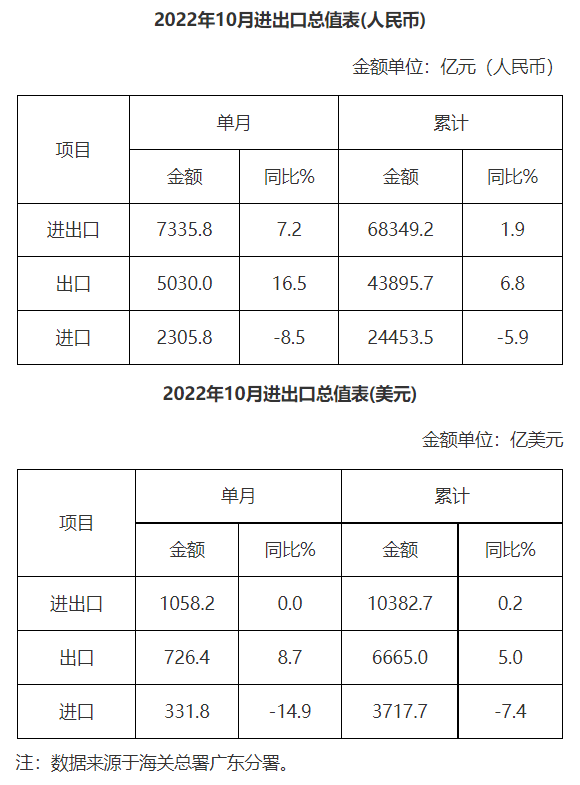 廣東省外貿(mào)進出口總值表(2022年10月)