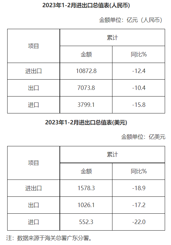 廣東省外貿(mào)進(jìn)出口總值表(2023年1-2月)
