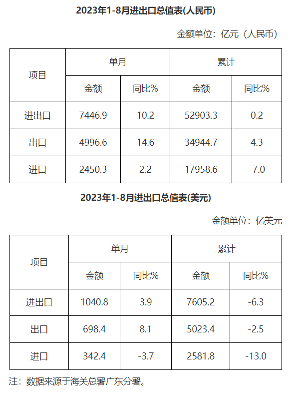 廣東省外貿(mào)進(jìn)出口總值表(2023年1-8月)