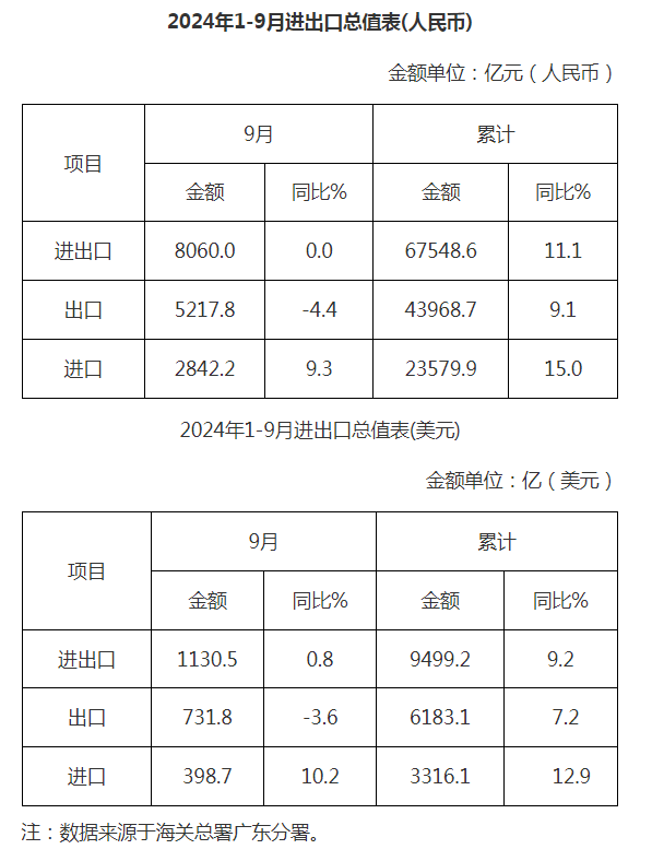 廣東省外貿(mào)進(jìn)出口總值表(2024年1-9月)