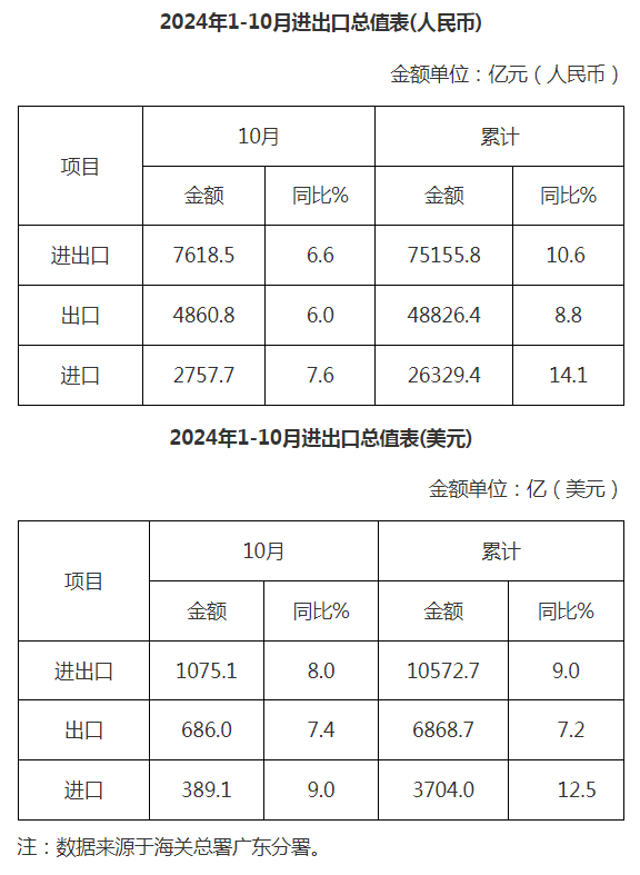 廣東省外貿(mào)進(jìn)出口總值表(2024年1-10月)