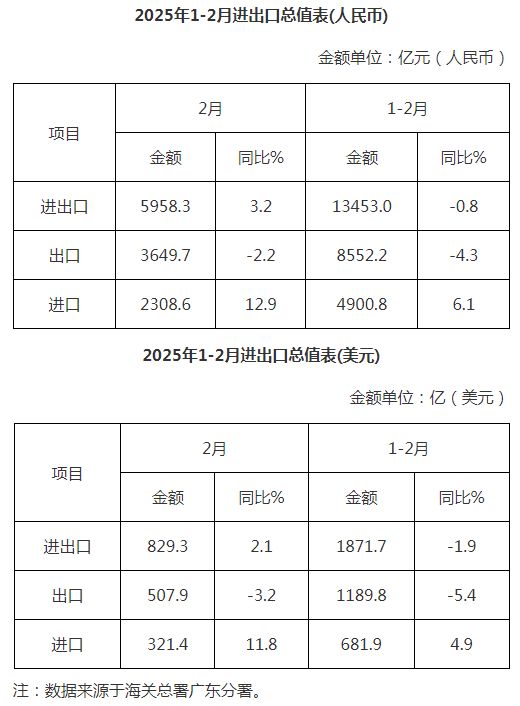 廣東省外貿(mào)進(jìn)出口總值表(2025年1-2月)