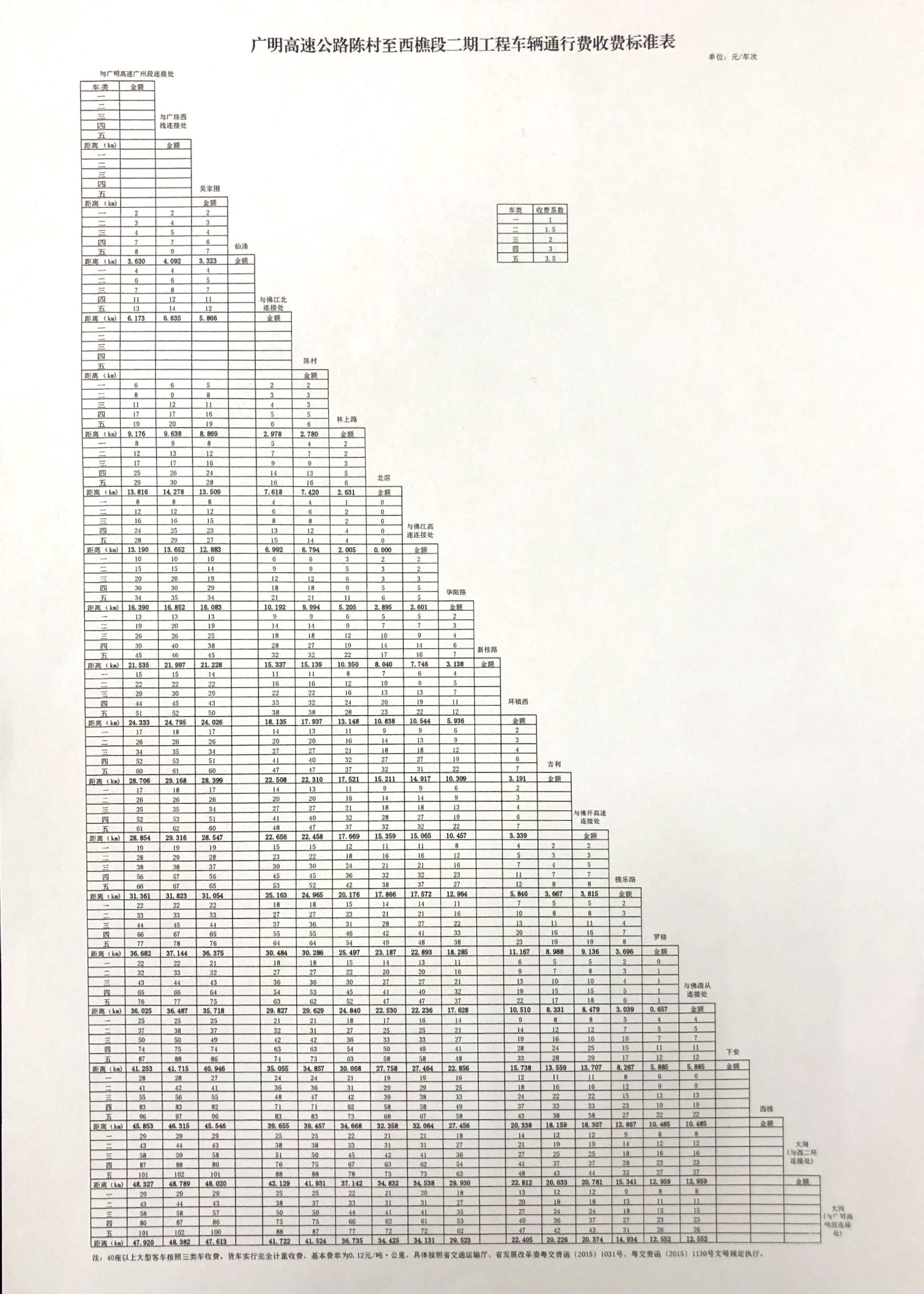 粵交費〔2019〕363號請示收悉。同意廣明高速公路陳村至西樵段二期工程交工驗收通車和收費站收費設施經驗收符合省聯(lián)網收費技術要求后開始收費,收費車型按國家統(tǒng)一標準進行分類,1至5類車的收費系數分別為1、1.5、2、3、3.5;貨車實行完全計重收費,基本費率為0.12元/噸·公里。