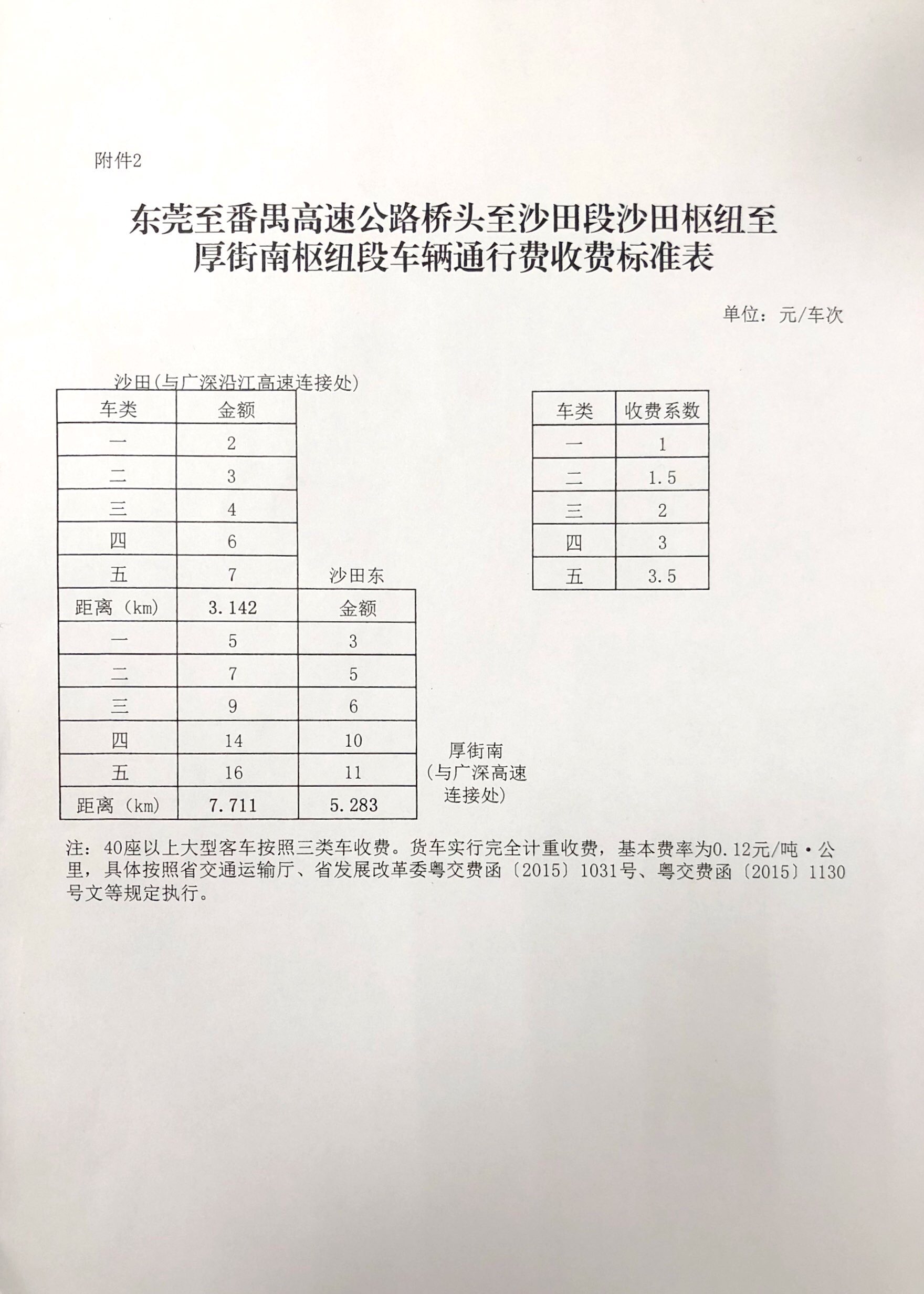粵交費〔2019〕333號請示收悉。同意東莞至番禺高速公路橋頭至沙田段沙田樞紐至厚街南樞紐段交工驗收通車和收費站收費設(shè)施經(jīng)驗收符合省聯(lián)網(wǎng)收費技術(shù)要求后開始收費,收費車型按國家統(tǒng)一標(biāo)準進行分類,1至5類車的收費系數(shù)分別為1、1.5、2、3、3.5;貨車實行完全計重收費,基本費率為0.12元/噸·公里。