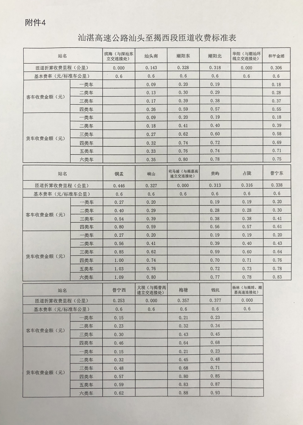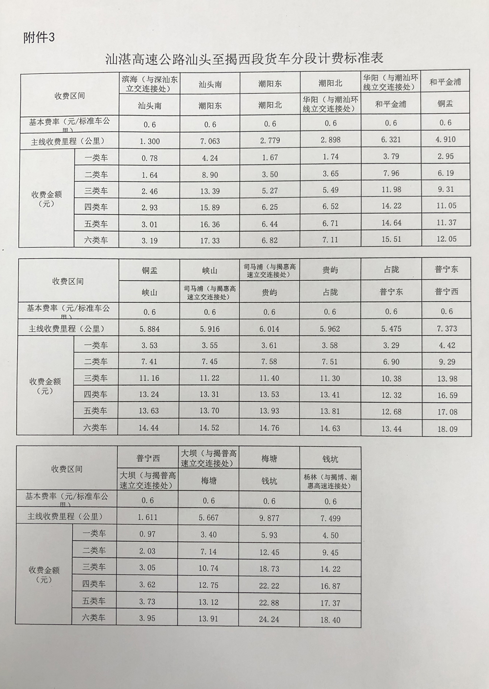 粵交營〔2020〕421號請示收悉。同意汕湛高速公路汕頭至揭西段交工驗收通車和收費設施經驗收符合聯(lián)網收費技術要求后開始收費,收費車型執(zhí)行《收費公路車輛通行費車型分類》(JT/T489-2019),收費費率為0.6元/標準車公里,1至4類客車的收費系數(shù)分別為1、1.5、2、3,1至6類貨車的收費系數(shù)分別為1、2.1、3.16、3.75、3.86、4.09,專項作業(yè)車的收費標準參照貨車執(zhí)行。