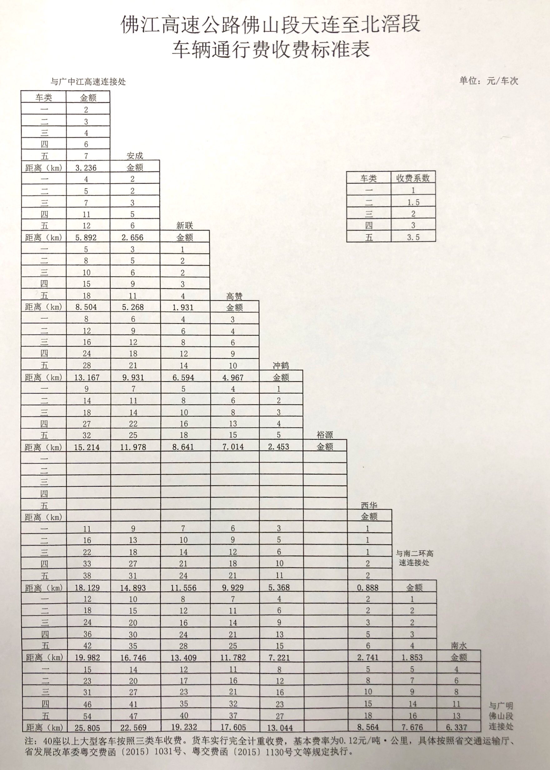 粵交費〔2019〕43號請示收悉。同意佛江高速公路佛山段天連至北滘段交工驗收通車和收費站收費設(shè)施經(jīng)驗收符合省聯(lián)網(wǎng)收費技術(shù)要求后開始收費,收費車型按國家統(tǒng)一標(biāo)準(zhǔn)進行分類,1至5類車的收費系數(shù)分別為1、1.5、2、3、3.5,收費費率為0.60元/標(biāo)準(zhǔn)車公里;貨車實行完全計重收費,基本費率為0.12元/噸·公里。